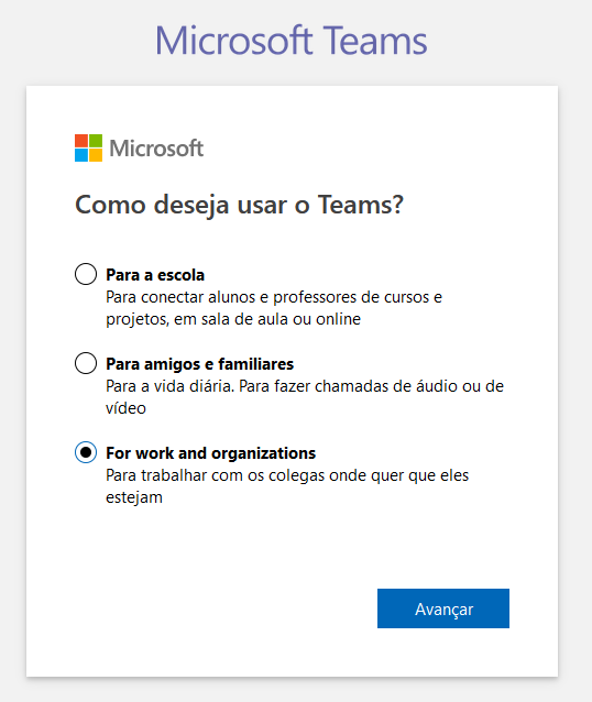 3. Selecine a opção "For Work and Organizations" e clique no botão "Avançar";