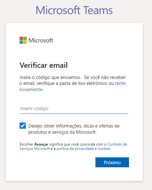 6. Insira o código que será enviado para seu e-mail cadastrado e clique no botão "Próximo";