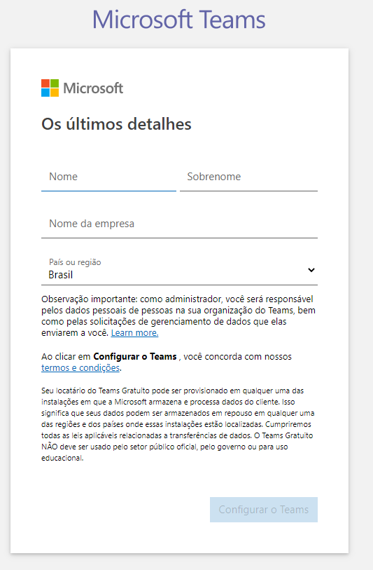 7. Preencha os dados solicitados e clique no botão "Configurar o Teams";